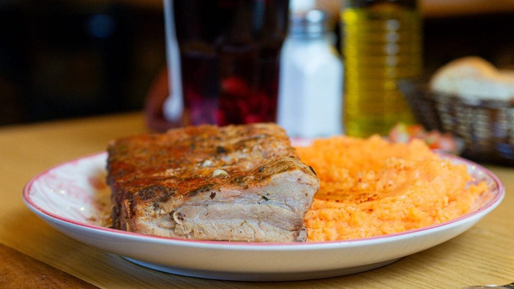 El Costillar de Cerdo con Puré Picante en el restaurant El Hoyo es otro de los favoritos del público. Una porción generosa en carne de intenso color dorado y costra crujiente. Se agradece que el trozo venga con algunas partes de malaya, lo que agrega un porcentaje de grasa ideal para que ésta quede más jugosa. El puré con ají merkén aporta en todo sentido y le da personalidad a la proteína, funciona perfectamente como agregado y cumple con la preparación final.