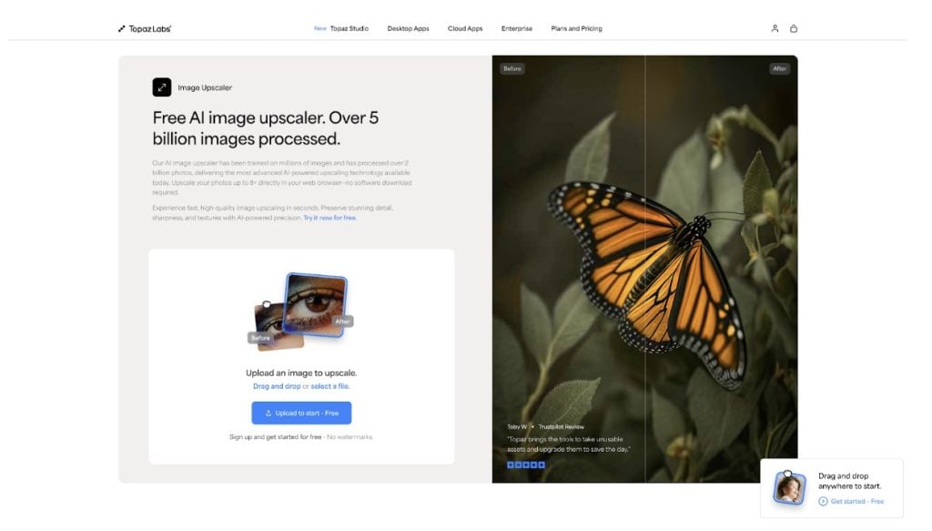 Topazlabs ofrece una de las herramientas de escalado con IA más avanzadas disponibles de forma gratuita. Puede ampliar imágenes hasta 8× manteniendo detalles naturales y texturas realistas. Esto la hace ideal para fotógrafos, diseñadores y cualquier persona que necesite resultados de calidad premium. La herramienta utiliza potentes modelos de IA entrenados con millones de imágenes, por lo que maneja muy bien fotos de baja resolución o ligeramente dañadas.