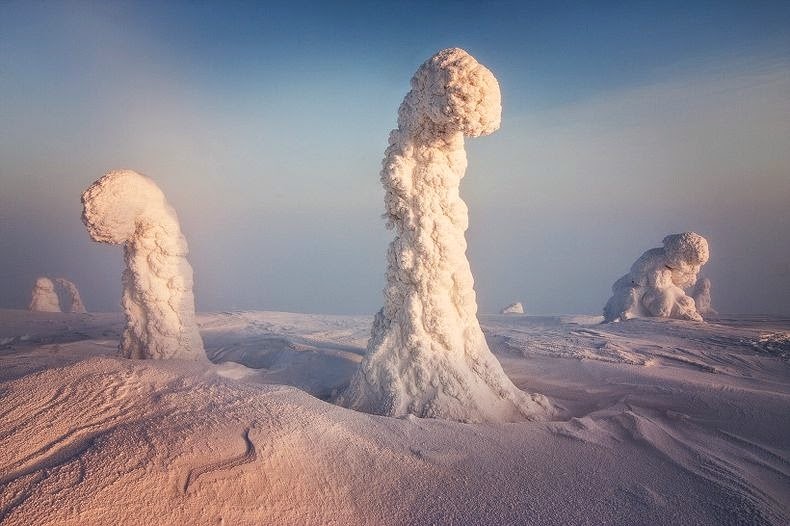 Son árboles gigantescos cubiertos de nieve y hielo.
